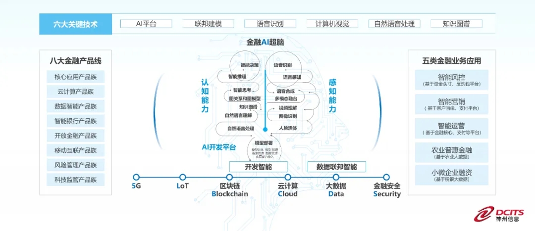 一直以来,AI能力建设都是各金融机构战略布局的重点关注方向。此次神州信息推出金融超脑Sm@rtFSB便是针对AI技术垂直领域的新产品。作为一款企业级的金融AI中台解决方案,金融超脑Sm@rtFSB可基于人工智能前沿、大数据、云计算及区块链等底层技术,为金融机构提供智能营销、智能风控、智能运营、农业普惠金融、小微企业融资等一整套AI能力体系。其整体技术架构按照“一基一核两翼”整体研发路标进行搭建,主要由金融AI开发平台、感知能力平台、认知能力平台三个核心模块构成。